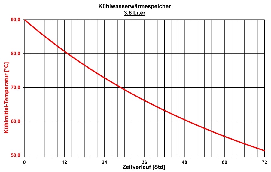 - Das Abkühlungsverhalten (Energieverlust) eines ausgeführten Kühlwasserspeichers mit 3,6 Liter Inhalt ist in oben stehendem Diagramm über eine Verweilzeit von 72 Stunden bei 20°C Umgebungstemperatur ersichtlich
